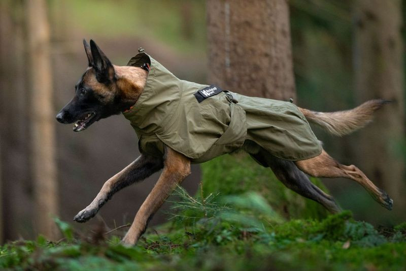 Fjord raincoat WD je přepracovaná verze oblíbené pláštěnky Fjord raincoat. Má stejný střih, ale je součástí Working Dog edice, která je primárně určena pro pracovní či sportovní psy ve vysoké aktivní zátěži, tedy zejména policejní, hasičské či záchranářské kynologické týmy. Její přednosti však najdou využití i v běžném životě, například při túrách do přírody nebo při použití v náročnějších podmínkách. Nabízí totiž vysokou úroveň ochrany před deštěm (vodní sloupec 15 000 mm) a větrem, přičemž zůstává vysoce prodyšná (13 000 g/m²/24h), což zajišťuje tepelný komfort i při dlouhodobém nošení. Robustní svrchní materiál s odolným popruhem na hrudi vydrží intenzivní používání, zatímco tichá nešustivá tkanina nerozptyluje psa při práci. Možnost přizpůsobení velikosti v oblasti krku, hlavy a hrudníku spolu s popruhy na zadních nohách zaručují stabilitu za pohybu i ve větru. Břišní část je vybavena drenážními otvory pro odvod vlhkosti a chrání psa před chladem i nečistotami. Pláštěnka je kompatibilní s postroji (včetně tahacích) a nabízí suché zipy pro připevnění reflexních nebo identifikačních nášivek.